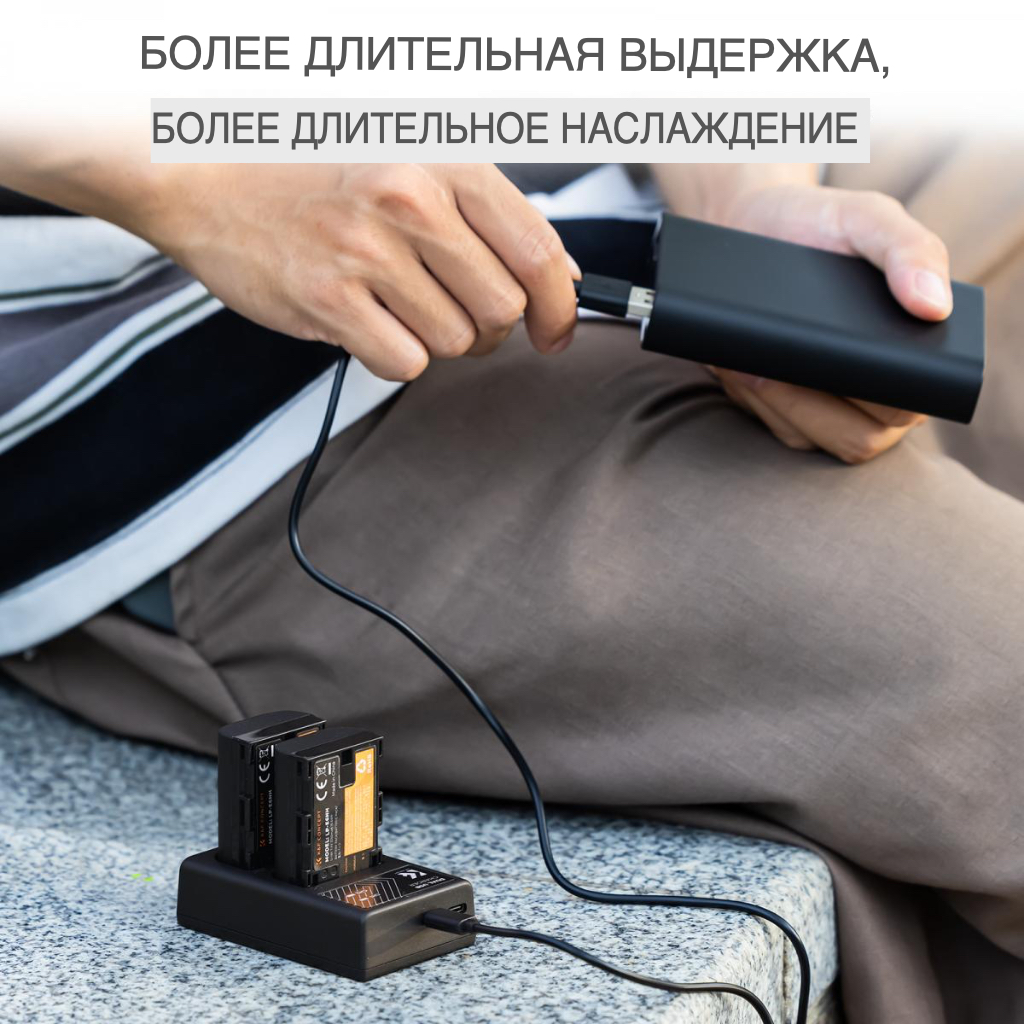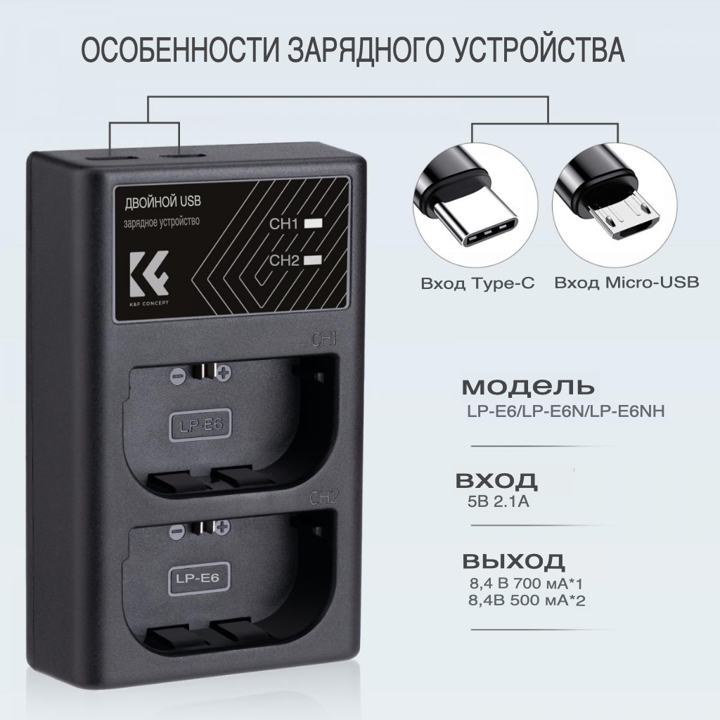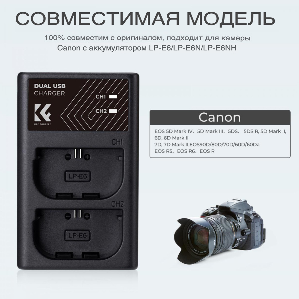- Зарядное устройство и два аккумулятора K&F Concept KF28.0021 LP-E6NH 2250 мАч для Canon. 100% совместимость с батареями камеры LP-E6NH/LP-E6N/LP-E6, модели камер: Canon EOS R5, EOS R6, EOS R, EOS 5D Mark IV, 5D Mark III, 5DS, 5DS R, 5D Mark II, 6D, 6D Mark II, 7D, 7D Mark II, 90D, 80D, 70D, 60D, 60Da